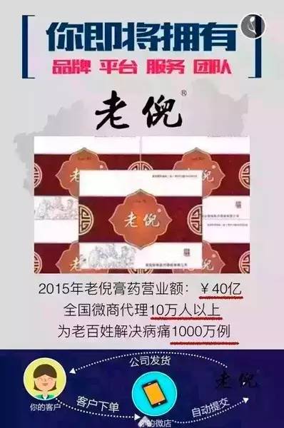 迅速暴富的成功學(xué),讓“老倪膏藥”成了朋友圈里最狂熱的生意。老倪團(tuán)隊(duì)成員發(fā)布的廣告自稱,2015年,“老倪膏藥”全國(guó)微商代理已超10萬(wàn)人,營(yíng)業(yè)額突破40億元。
