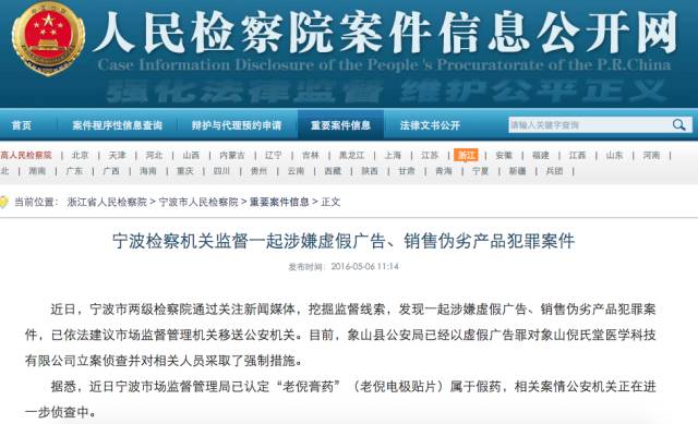 寧波檢察機(jī)關(guān)監(jiān)督一起涉嫌虛假?gòu)V告、銷售偽劣產(chǎn)品犯罪案件