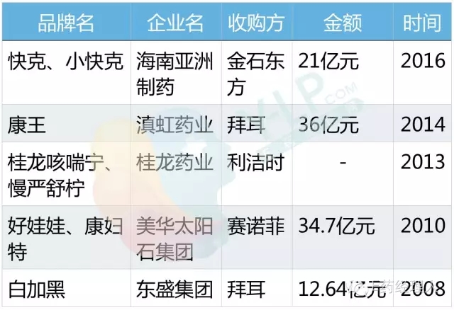 近年來,品牌OTC企業(yè)賣掉也算不得什么新鮮事了。2013年,英國快消領(lǐng)域巨頭利潔時收購OTC品牌藥企桂龍藥業(yè);2014年,拜耳公司以36億元的價格收購了滇虹藥業(yè)集團(tuán)100%股權(quán)。而更早的,賽諾菲收購太陽石藥業(yè)、拜耳收購白加黑等等。