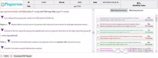 該故事起源于有個讀者向美國知名英文論文抄襲監(jiān)測網(wǎng)站PlagiarismWatch匿名舉報一篇中國研究組的文章“Decreased miR-452 expression in human colorectal cancer andits tumor suppressive function.Genet MolRes.2016May23;15(2).doi:10.4238/gmr.15027730.PMID:27323070(file short name:GMR7730)”有嚴(yán)重抄襲。PlagiarismWatch的人員就“吃飽了”順便用英文查重軟件系統(tǒng)iPlagiarism(中文叫艾普蕾)查了一下,發(fā)現(xiàn)確實(shí)有大量的文本抄襲,比例高達(dá)1/3左右。
