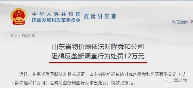 上周五,因?yàn)閴艛嘣纤?,國家工商總局?duì)武漢新興精英醫(yī)藥有限公司罰款220萬。今天,發(fā)改委官網(wǎng)發(fā)出消息,接受舉報(bào)后,國家發(fā)改委在調(diào)查濰坊隆舜和醫(yī)藥有限公司是否存在原料藥壟斷行為時(shí),該公司阻礙調(diào)查,因此被罰12萬。