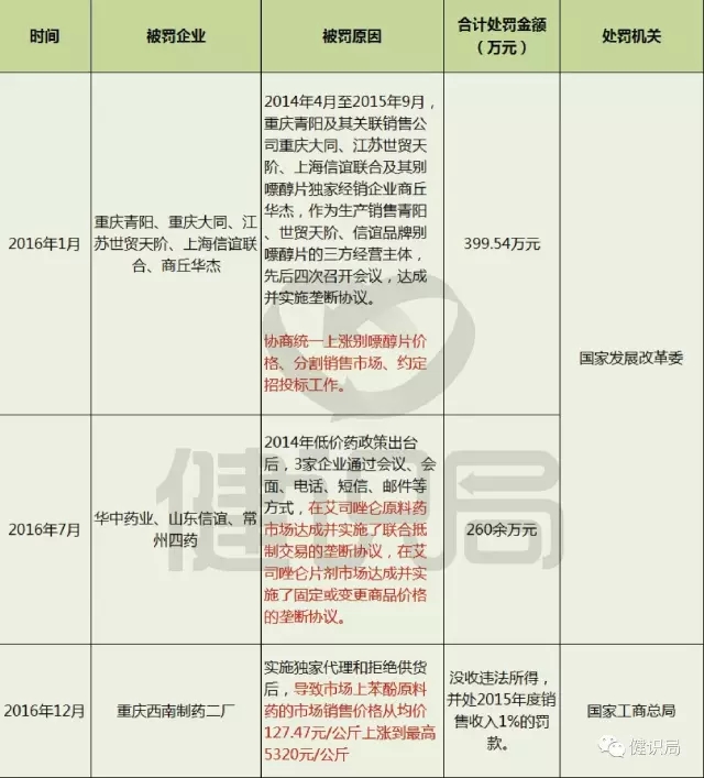 雖然公司人員阻礙發(fā)改委官員調(diào)查比較罕見,不過,事件背后仍是備受業(yè)界關(guān)注的原料藥壟斷問題。去年以來已經(jīng)多家醫(yī)藥企業(yè)因?yàn)閴艛啾惶幜P,原料藥已經(jīng)成為壟斷查處的重點(diǎn)。下面是去年以來因?yàn)樵纤帀艛啾话l(fā)改委、工商總局查處的企業(yè)。