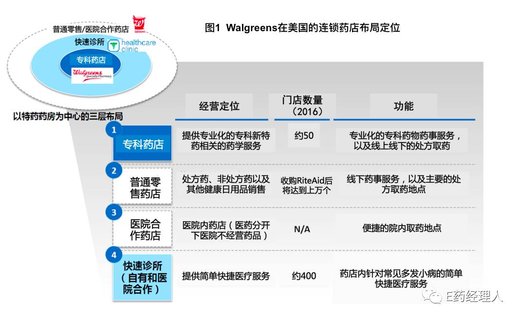 在美國,WBA于2016年收購了RiteAid藥店,成為了美國銷售收入和零售門店最大的藥品零售連鎖巨頭。在這之前,WBA 與美國藥品分銷巨頭AmerisourceBergen簽訂十年期的戰(zhàn)略聯(lián)盟關(guān)系,形成了藥品的零售和分銷業(yè)務(wù)之間的緊密聯(lián)系和協(xié)同效應(yīng)。此外,更重要的是,根據(jù)客戶不同的臨床需求和購藥習(xí)慣,WBA在美國布局了完全不同類型的零售藥店形態(tài),用以滿足客戶之間的不同需求(圖1)。