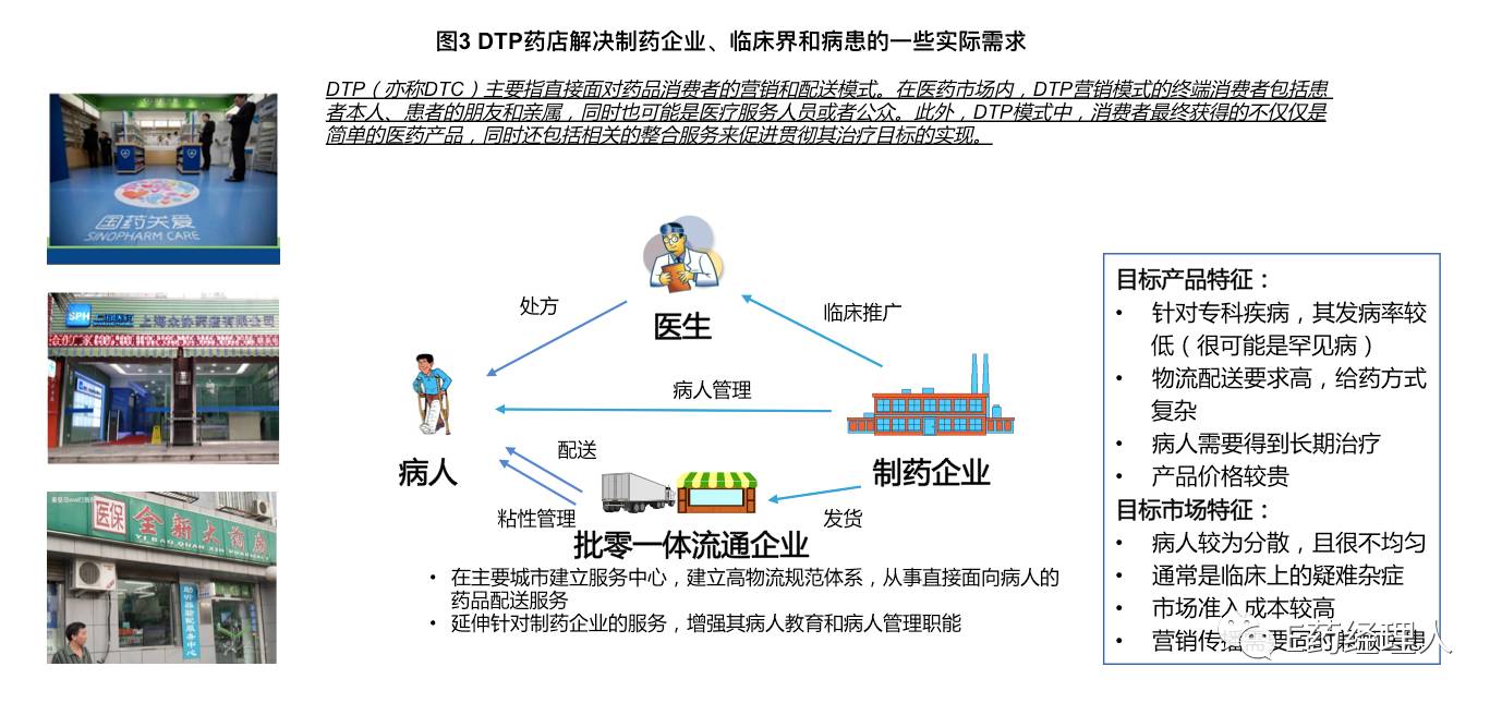 這些不同類型的零售藥店的經(jīng)營行為或者經(jīng)營業(yè)態(tài)之間存在一定的差異,不過它們的理念應(yīng)當(dāng)是大同小異的。與醫(yī)藥分銷業(yè)務(wù)開展增值服務(wù)類似,如何最大效率地協(xié)調(diào)有效資源,滿足臨床各方面的需求將是企業(yè)核心競爭力的體現(xiàn)。這在藥品零售業(yè)內(nèi)新興的DTP業(yè)務(wù)中表現(xiàn)得也最為明顯(圖3)。
