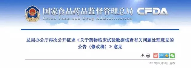 國家食品藥品監(jiān)督管理總局現(xiàn)將修改后的《關(guān)于藥物臨床試驗數(shù)據(jù)核查有關(guān)問題處理意見的公告(修改稿)》再次向社會公開征求意見。請于2017年4月21日前將有關(guān)意見以電子郵件形式反饋國家食品藥品監(jiān)督管理總局藥品化妝品注冊管理司。