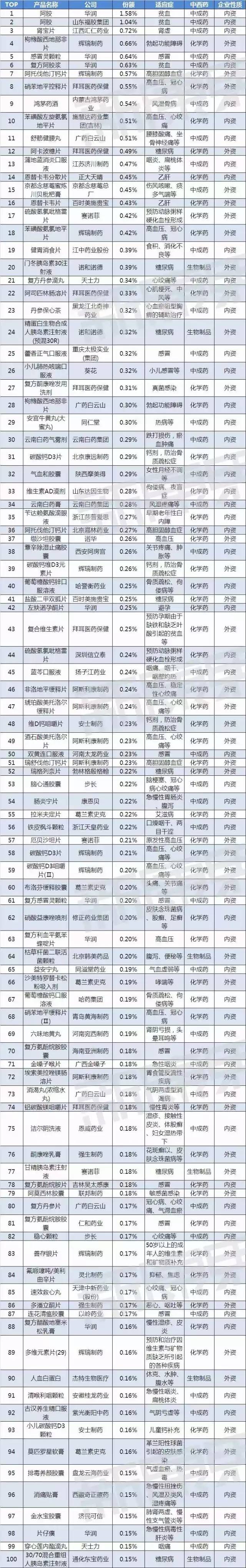 2016年國(guó)內(nèi)零售終端藥物份額TOP100