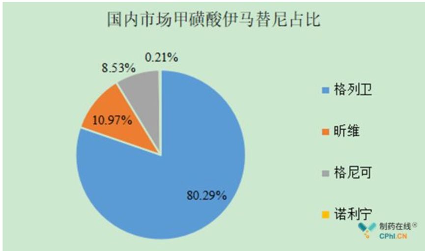 此前,國(guó)內(nèi)市場(chǎng)在售的甲磺酸伊馬替尼市場(chǎng)由4家生產(chǎn)企業(yè)分割,原研廠家諾華的格列衛(wèi)市場(chǎng)份額最高,為80.29%,江蘇豪森的昕維市場(chǎng)份額為10.97%,正大天晴的格尼可市場(chǎng)份額為8.53%,石藥歐意的諾利寧市場(chǎng)份額為0.21%。
