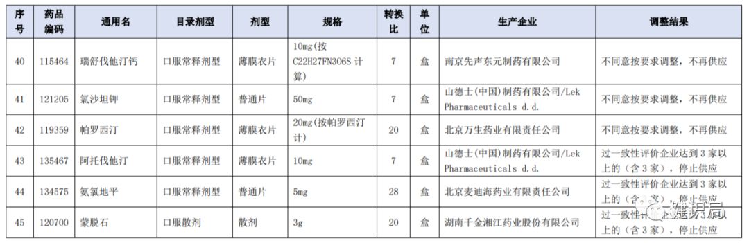 這意味著,繼續(xù)供應(yīng)的藥品,已經(jīng)按照上述要求實(shí)現(xiàn)降價(jià)。而沒有按照要求降價(jià)的,則已出局??梢钥吹?,全藥網(wǎng)公示的表格中,還有8個產(chǎn)品不同意按要求調(diào)整價(jià)格,不再供應(yīng)。