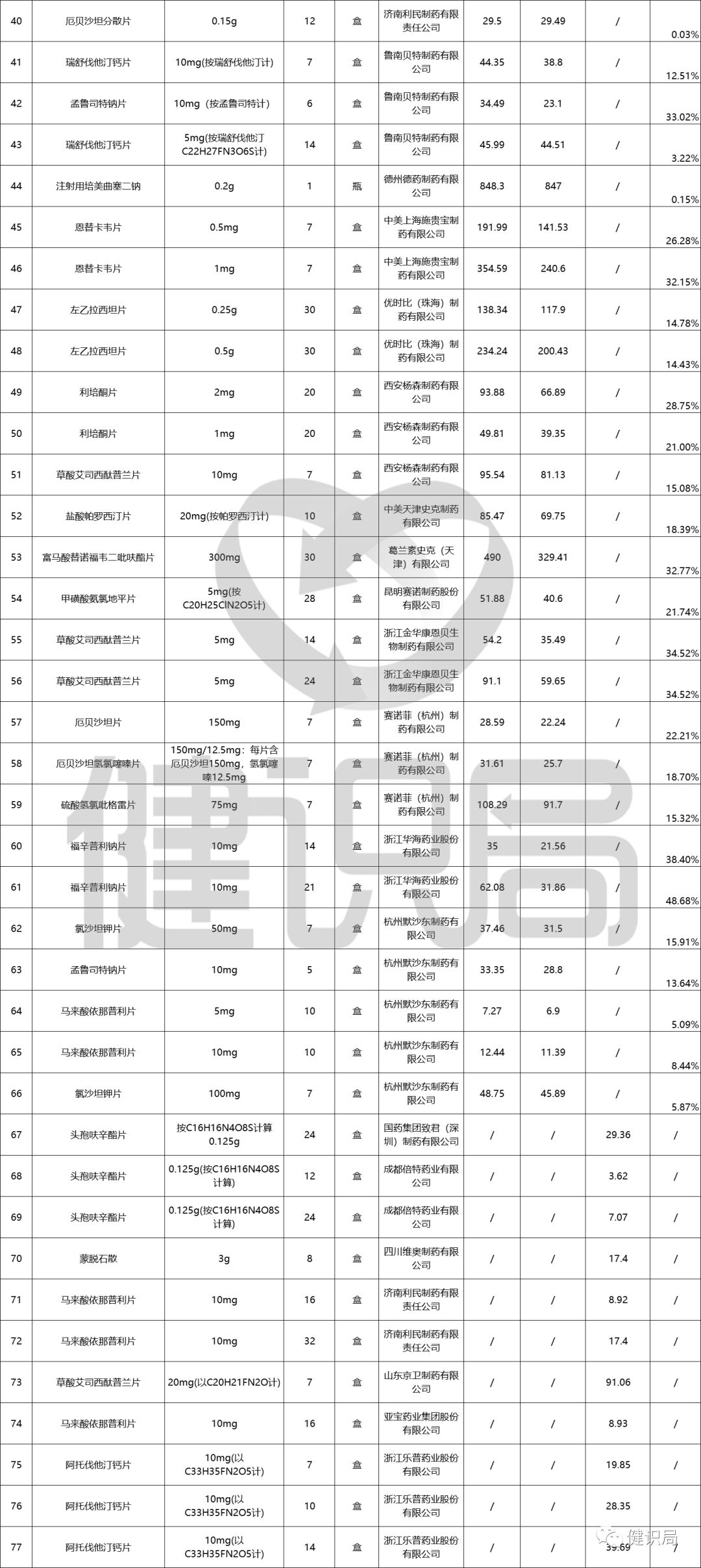 可以看到,包括輝瑞的立普妥(阿托伐他汀鈣片)、阿斯利康的可定(瑞舒伐他汀鈣片)、施貴寶的博路定(恩替卡韋片)在內(nèi)的諸多原研藥都在降價(jià)名單上。其中立普妥10mg,7片裝降價(jià)幅度高達(dá)42.03%;阿斯利康(簡稱“AZ”)的可定10mg、5mg,7片裝的降價(jià)幅度也都在20%以上。