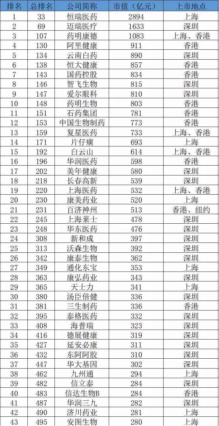今年新入圍的藥明生物以逾800億的市值排名醫(yī)藥企業(yè)第10位,還未盈利的信達(dá)生物以284億元的市值排名40位。