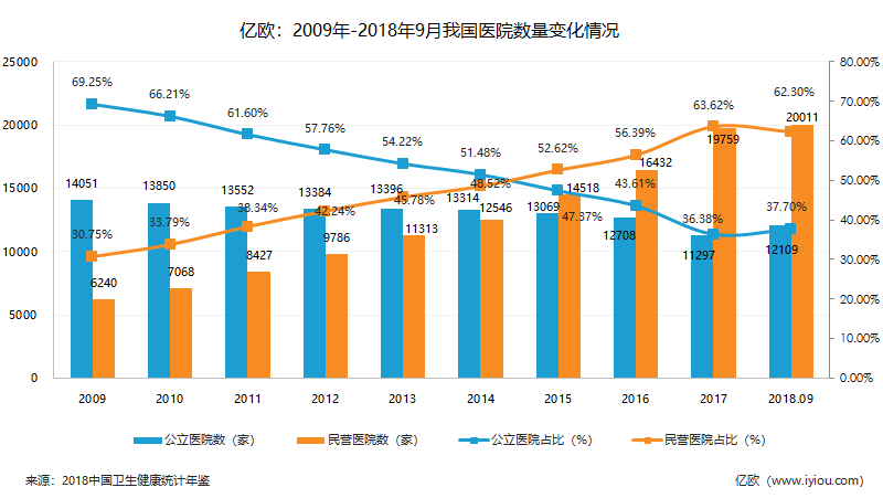 2009年,民營醫(yī)院進入“量變”時期。該年4月,新一輪醫(yī)療體制改革啟動?!岸嘣k醫(yī)”成為日后屢被提及的詞匯。同年,民營醫(yī)院數(shù)量迅速增長至6240家,占比30.75%。