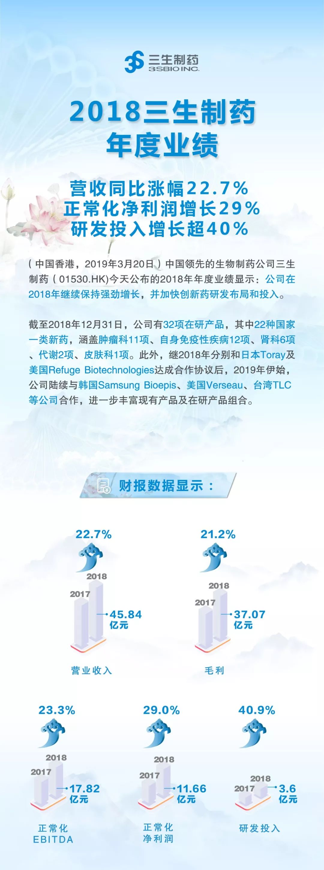 今天,三生制藥發(fā)布2018年報,業(yè)績出色,在眾多國內(nèi)藥企中獨樹一幟,無論是營收、利潤、研發(fā)投入都超過行業(yè)增幅。